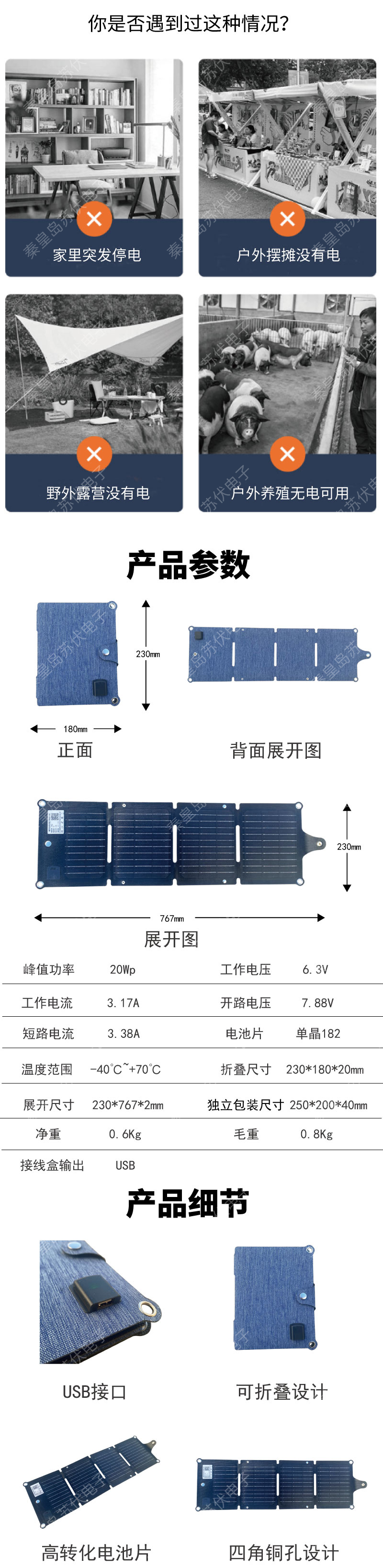 秦皇島新品20W便攜式太陽(yáng)能折疊包可移動(dòng)電源四折光伏充電板工廠